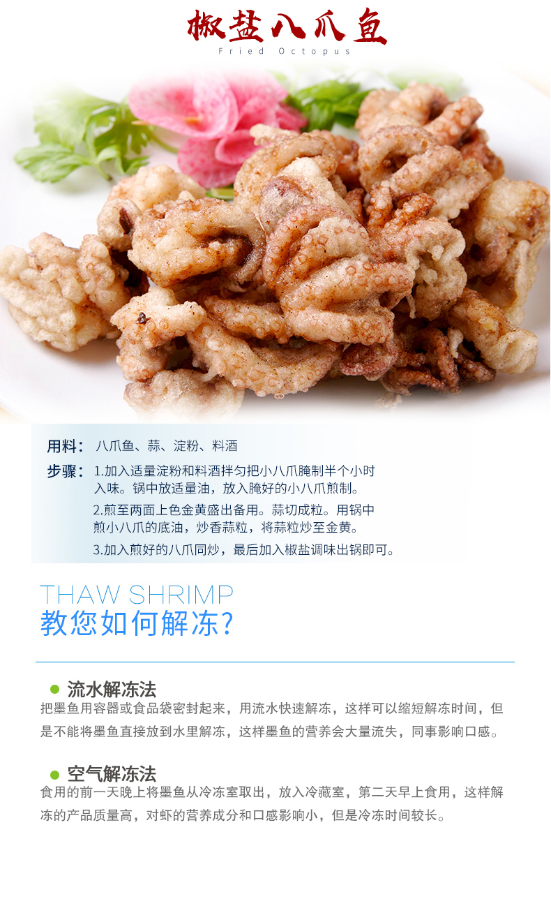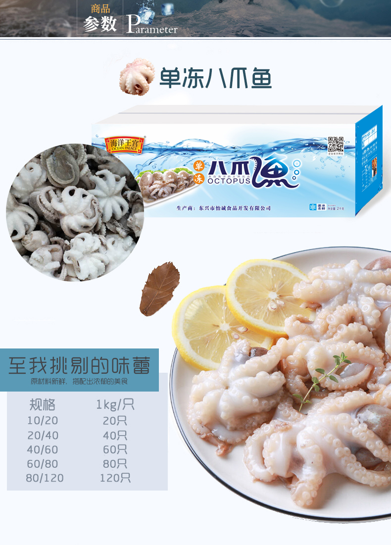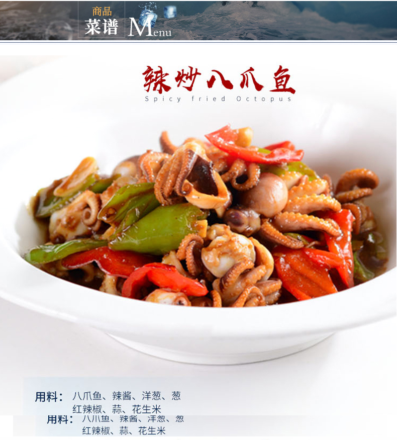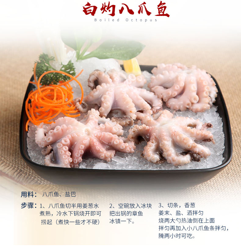 八爪魚又名章魚,是一種棲身于深海的軟體動物,因擁有八條細長的觸腕而得名,其肉質(zhì)爽厚脆嫩,清甜多汁,致密而富有彈性,并且含有天然的?;撬?,營養(yǎng)價值非常高,因此八爪魚不單單是美味的海鮮食材,而且也是民間食療進補的佳品。本產(chǎn)品取材于深海捕撈的鮮活八爪魚,以完善的冷凍保鮮技術和嶄新的高端流水生產(chǎn)線進行速凍加工,使八爪魚體內(nèi)蘊含的營養(yǎng)成分充分保留,并維持八爪魚鮮美爽嫩的天然口感。加工后的八爪魚產(chǎn)品晶瑩潔白,脆彈有勁,飽滿細滑,肉汁源源不斷滲出,鮮香撲鼻而來。產(chǎn)品可用于烹制各類菜肴,烹調(diào)方式包括清蒸、紅燒、干鍋、燜燉、熬制滋補湯品、滾涮火鍋等,用途豐富多樣。